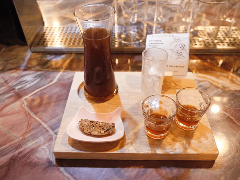 Здесь настоящая тайна уникальной креативности и серьезной ручной работы. После заваривания кофе вручную его продолжают готовить двумя разными способами. При первом способе кофе выливается в часто используемый для приготовления коктейлей шейкер, интенсивно взбалтывается вместе с кусочками льда, переливается высокий стакан и акцентирует внимание на концентрированном и ярком аромате кофейным зерен. При втором способе кофе прямиком выливается на предварительно замороженный кружочек льда и акцентирует внимание на резком кисловатом вкусе, который вы сразу же можете выразительно почувствовать, если возьмёте его сразу же после только что выпитой предыдущей чашки кофе.