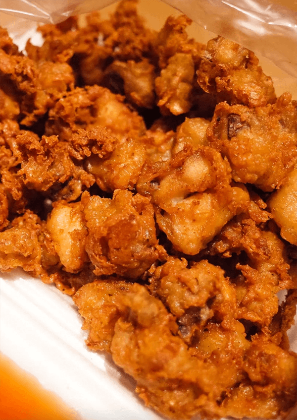 Порезанный на маленькие кусочки жареный цыплёнок красивого цвета, с хрустящей корочкой, имеет нежирное молодое куриное мясо и изумительный мягкий старинный вкус из детства жареных в масле продуктов. Жареный цыплёнок, дополненный жареным фруктовым льдом, является одним из козырей ночного рынка Санья.