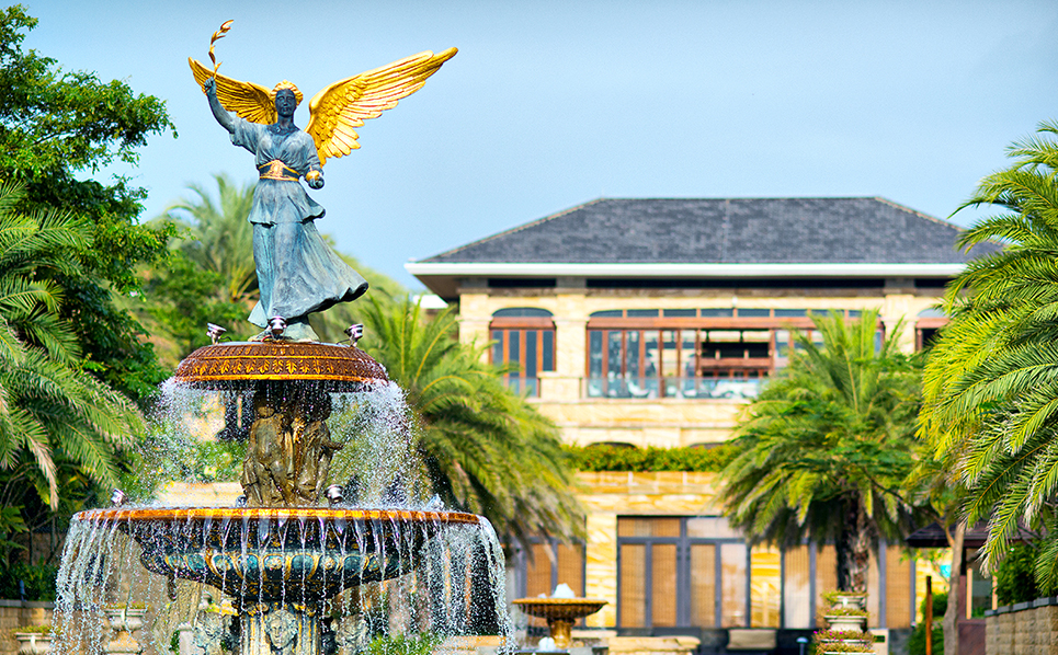 (1) Весь-вилажный курортный отель: Высокий уровень частной жизни. Удобства в виде пышно оформленных в европейском стиле вилл спрятаны в густых тропических садах. Стены облицованы натуральным песчаным камнем, полностью импортированным из Австралии. Напольные покрытия в номерах выполнены из мрамора с золотыми прожилками, а сантехника имеет 24-каратную золочную накладку, что позволяет гостям наслаждаться изысканностью.